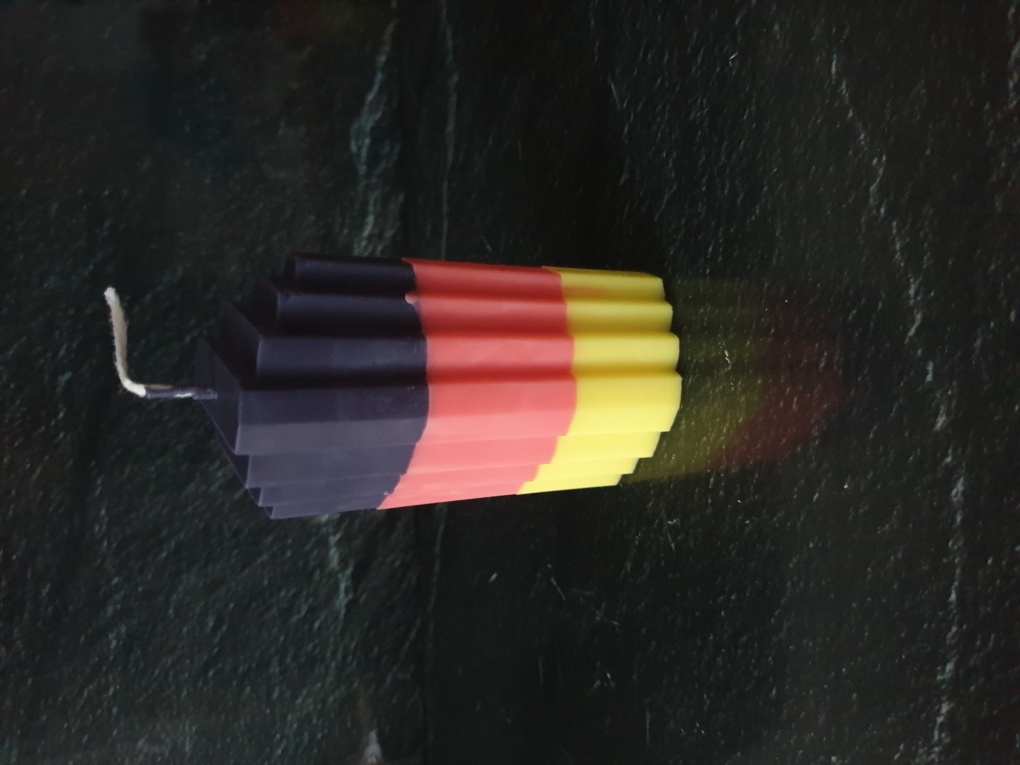 Die Kerze ist aus Rapswachs. Es wurden ca. 145 ml Wachs gegossen. Sie hat die Deutschland Farben. Sie ist 11 cm hoch und 6 cm breit.