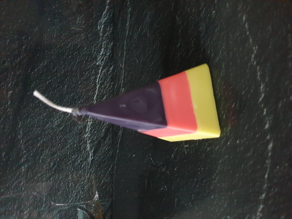 Die Kerze ist aus Rapswachs. Es wurden ca. 115 ml Wachs gegossen. Sie hat die Deutschland Farben. Sie ist 10 cm hoch und 5,5 cm breit.